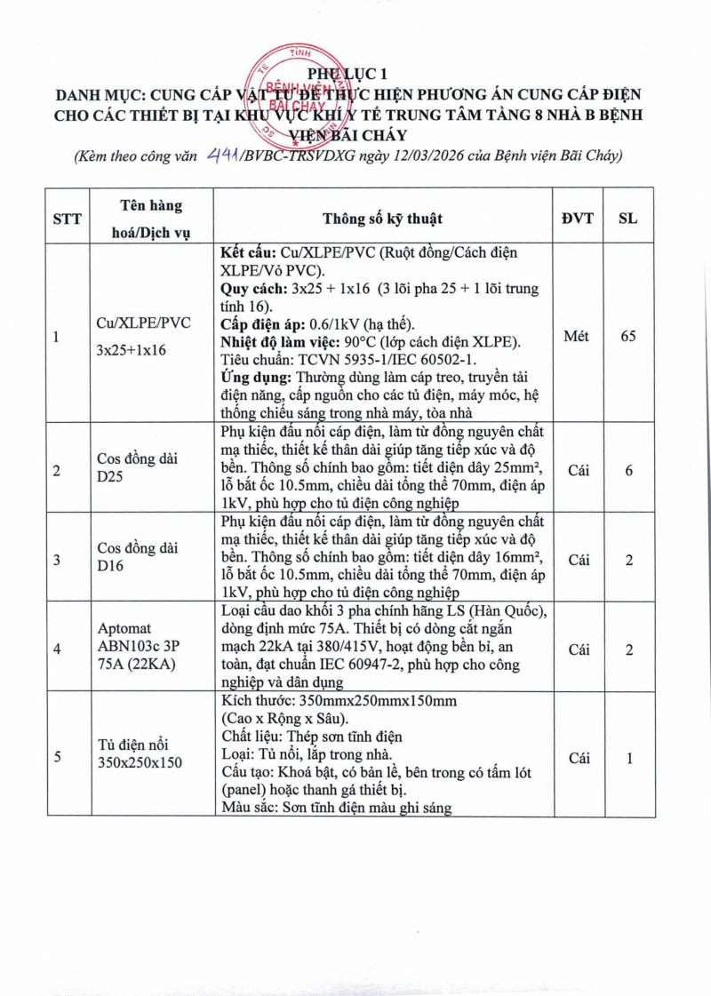 Thông báo số 441 về nhu cầu cung cấp vật tư để thực hiện phương án cung cấp điện cho các thiết bị tại khu vực y tế trung tâm tầng 8 nhà B Bệnh viện Bãi Cháy Hôm nay 09:51