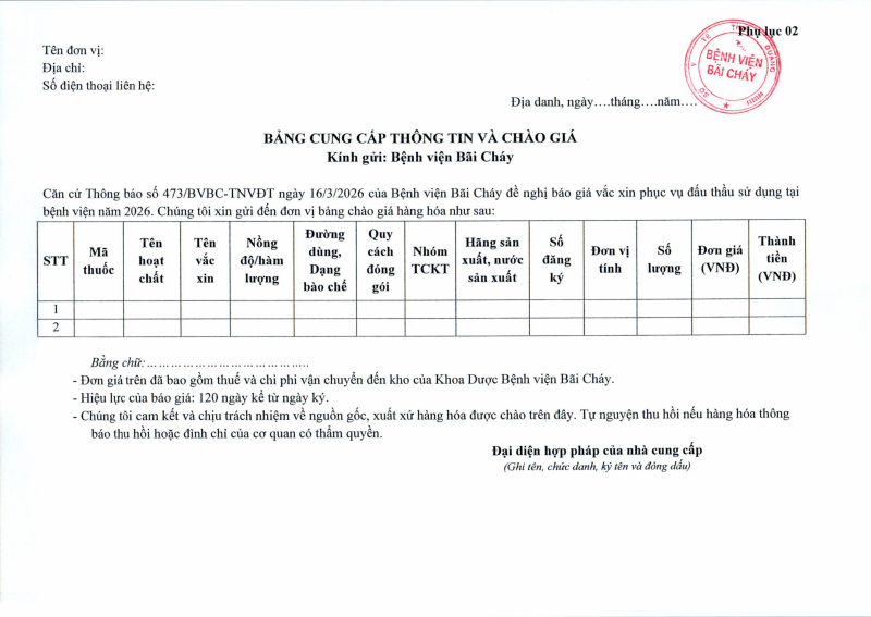 Thông báo số 473 về nhu cầu báo giá vắc xin phục vụ đấu thầu sử dụng tại bệnh viện năm 2026 2026/03/16 09:49