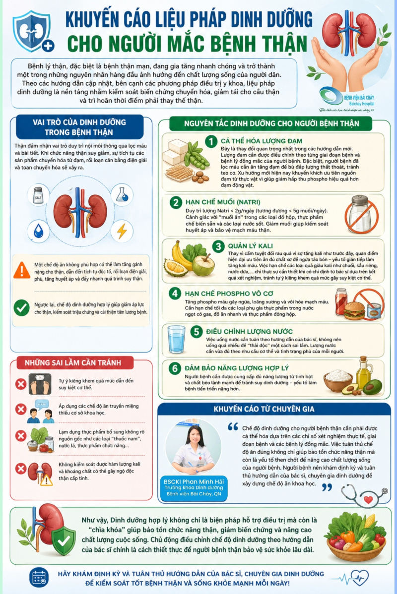 Bệnh lý thận, đặc biệt là bệnh thận mạn, đang ngày càng gia tăng và trở thành một trong những nguyên nhân ảnh hưởng nghiêm trọng đến chất lượng sống. Bên cạnh điều trị y khoa, dinh dưỡng đóng vai trò nền tảng giúp kiểm soát biến chứng, giảm gánh nặng cho thận và kéo dài thời gian chưa phải điều trị thay thế thận.