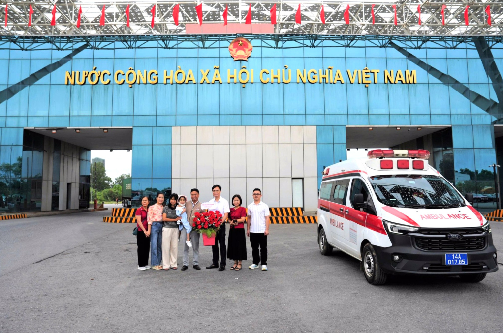 Ngày 24/4/2026, BSCKII Bùi Minh Cường, Giám đốc Bệnh viện Sản Nhi Quảng Ninh cùng đội ngũ cán bộ chuyên môn về điều trị Thalassemia đã trực tiếp ra đón em Giang tại khu vực Cửa khẩu Quốc tế Bắc Luân II sau khi hoàn tất quá trình điều trị tại Trung Quốc. Hình ảnh này thể hiện sự đồng hành, trách nhiệm của đội ngũ y tế trong suốt quá trình chăm sóc và điều trị bệnh nhi.