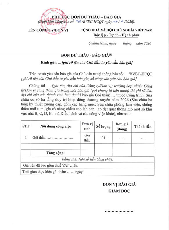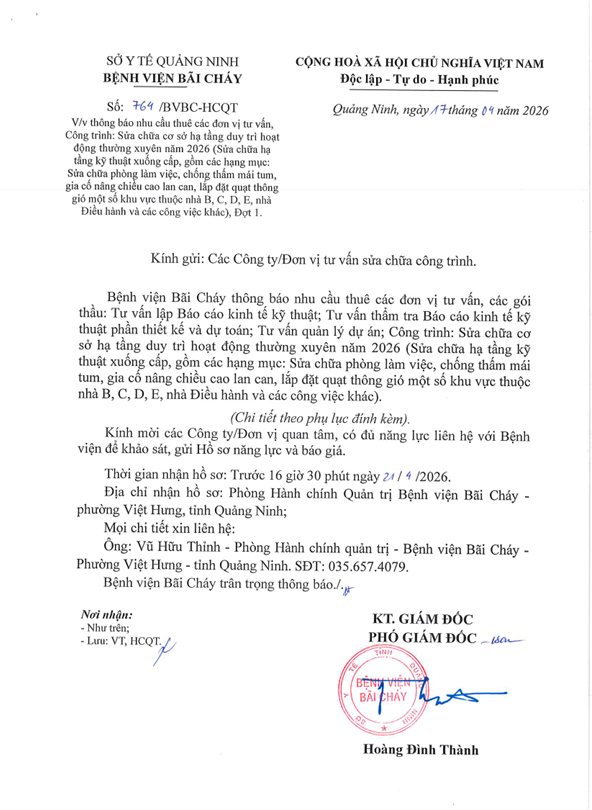 Thông báo 764 nhu cầu thuê các đơn vị tư vấn công trình