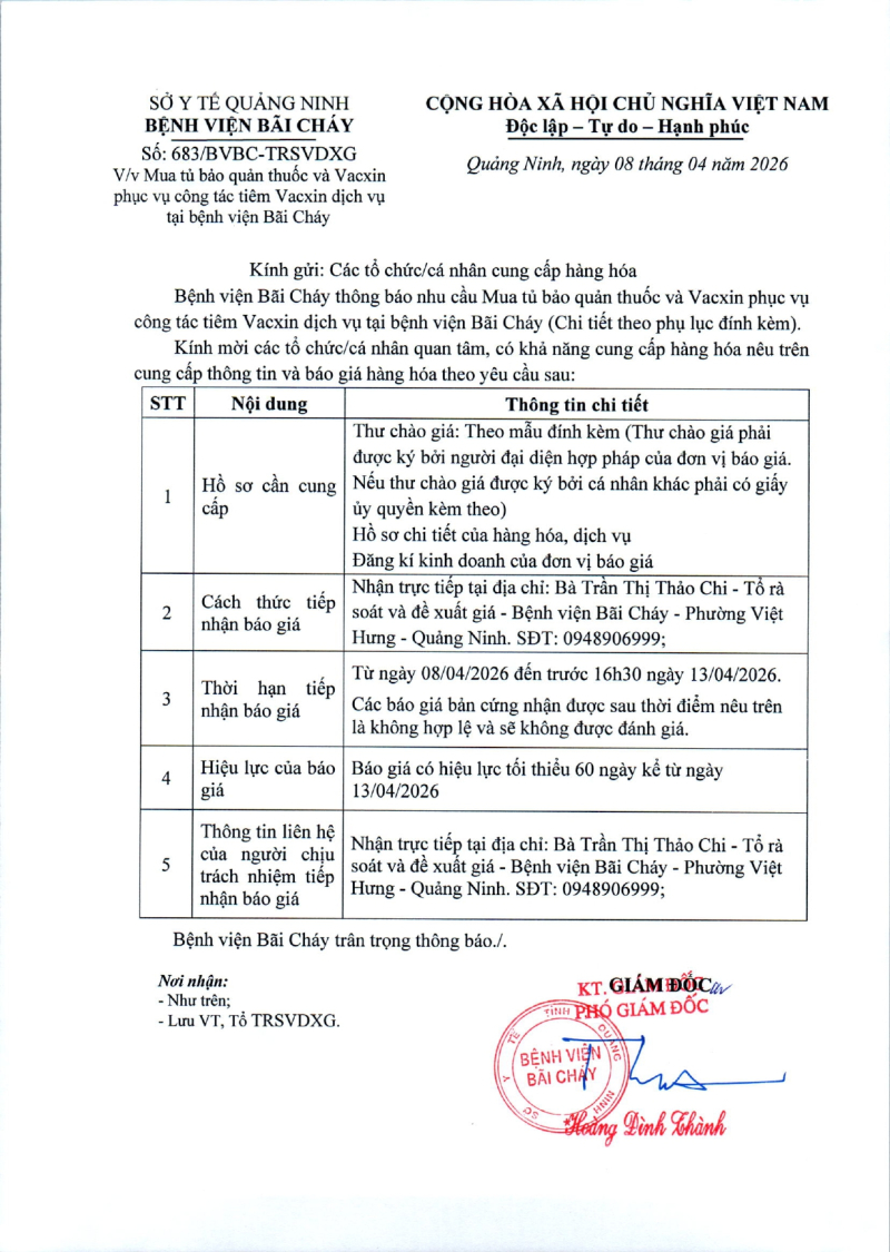 Thông báo số 683 về nhu cầu mua tủ bảo quản thuốc và vacxin phục vụ công tác tiêm vacxin dịch vụ tại bệnh viện Bãi Cháy 2026/04/08 08:04