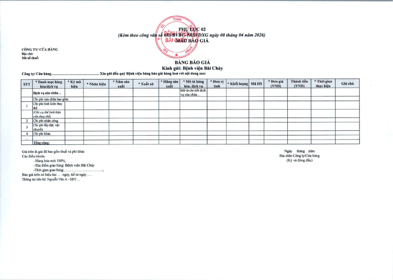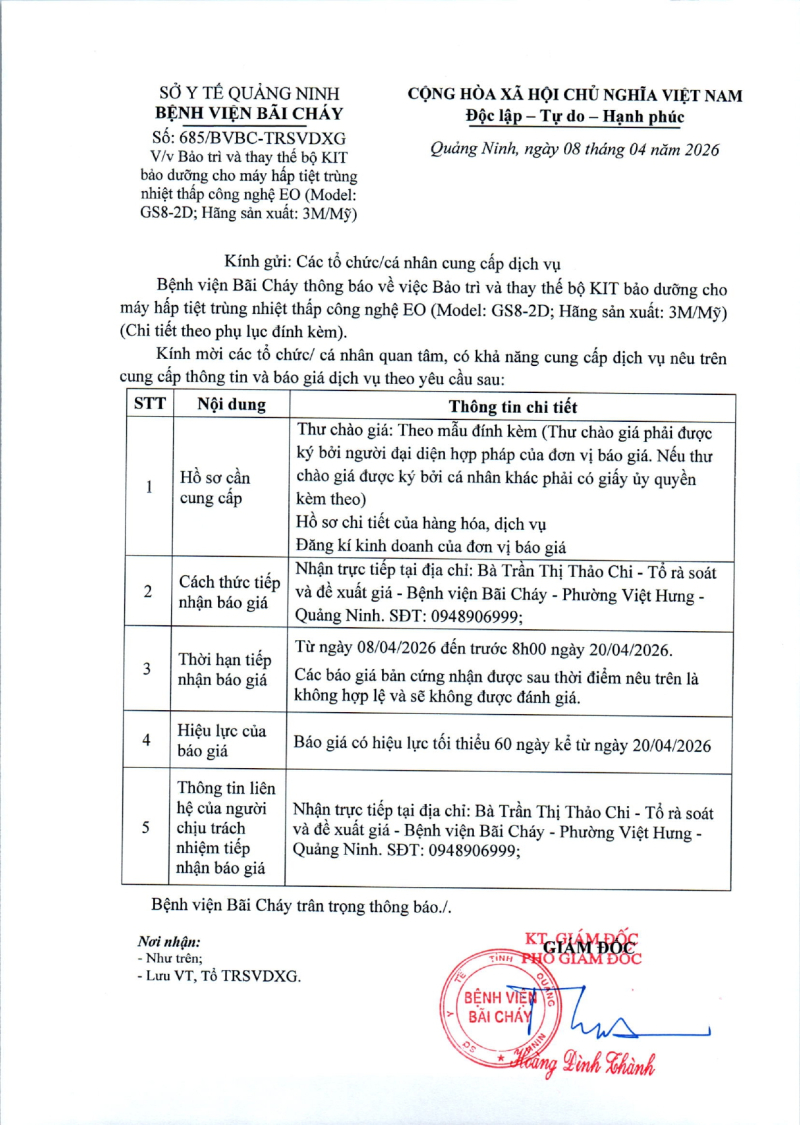 Thông báo số 685 về nhu cầu bảo trì và thay thế bộ KIT bảo dưỡng cho máy hấp tiệt trùng nhiệt thấp công nghệ EO Model: GS8-2D; Hãng sản xuất: 3M/Mỹ Hôm nay 08:11