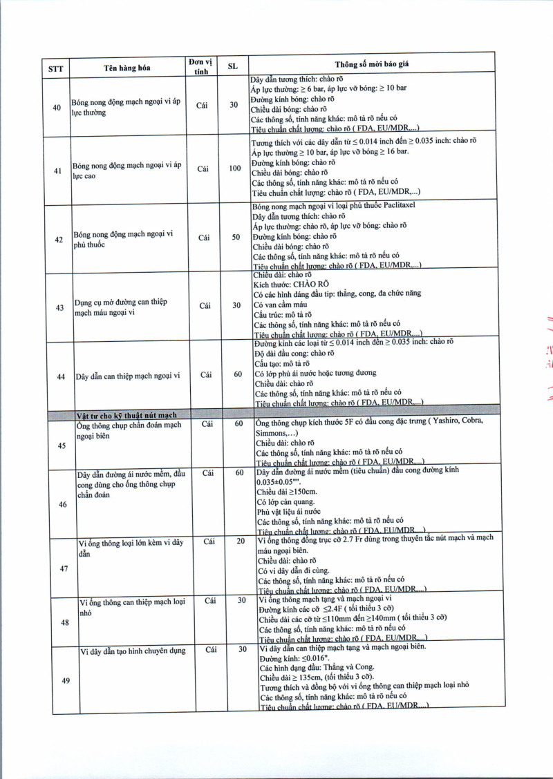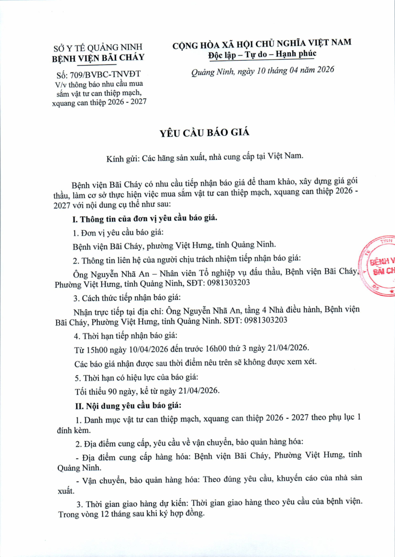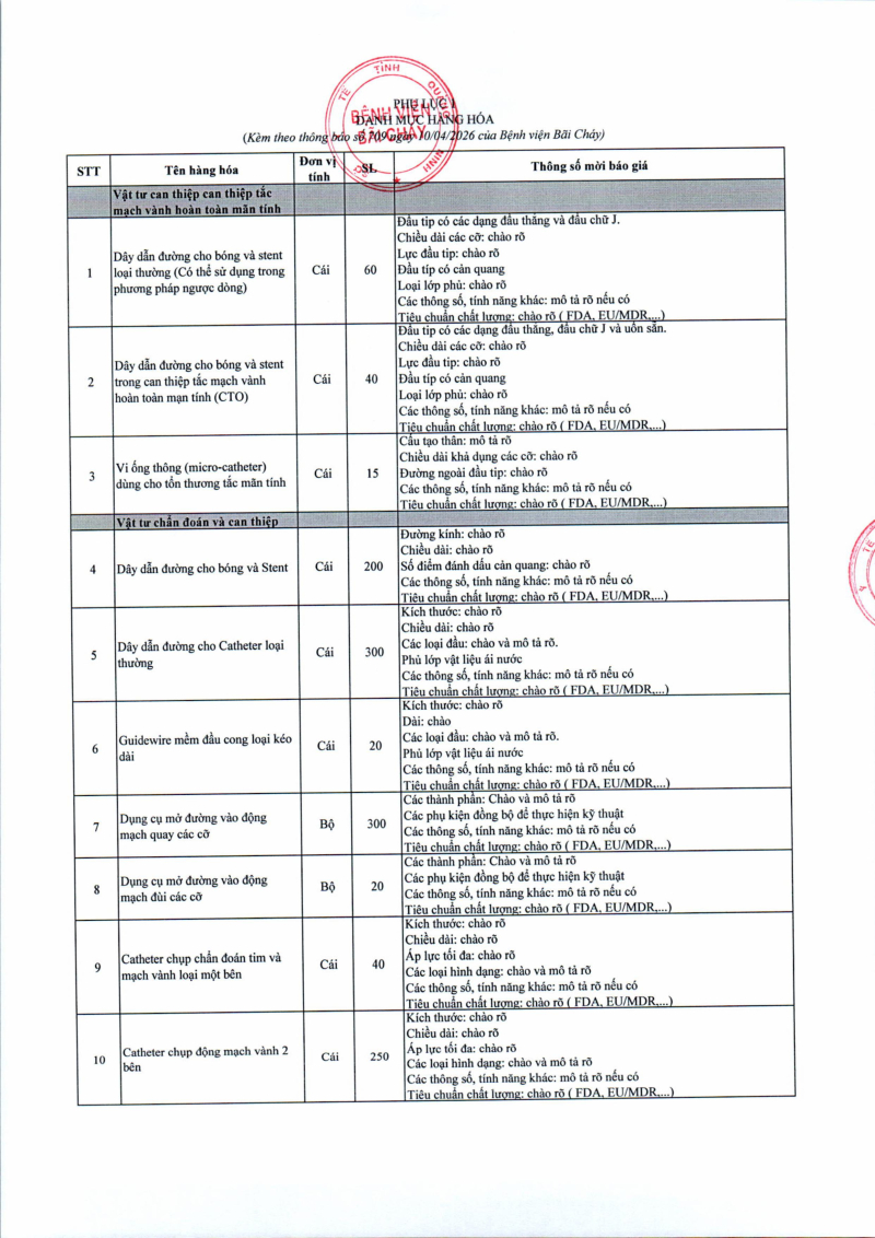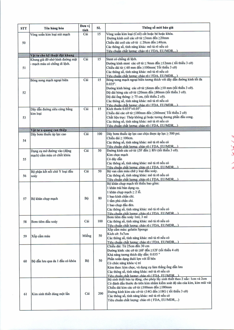 Thông báo số 709 về nhu cầu mua sắm vật tư can thiệp mạch, xquang can thiệp 2026,2027