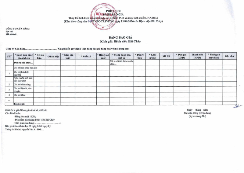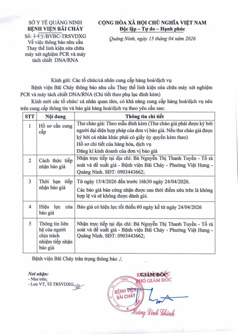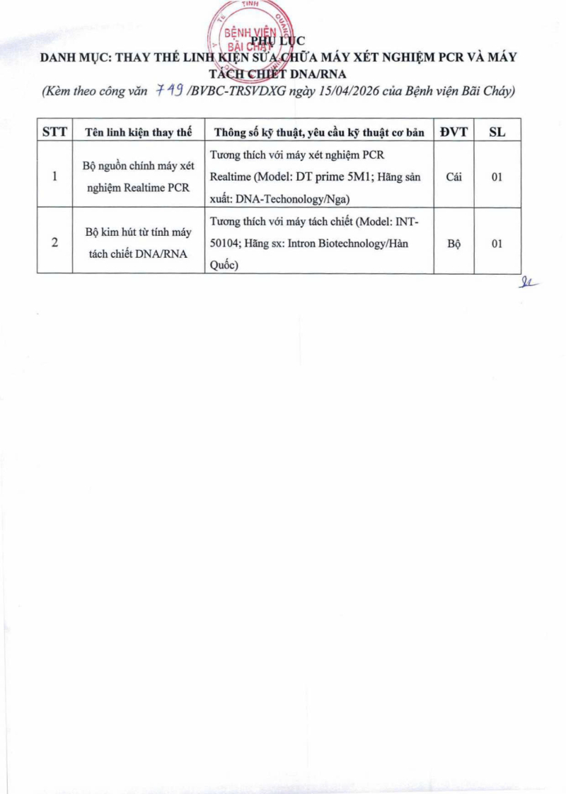 Thông báo số 749 về nhu cầu thay thế linh kiện sửa chữa máy xét nghiệm PCR và máy tách chiết DNA/RNA Hôm nay 07:39