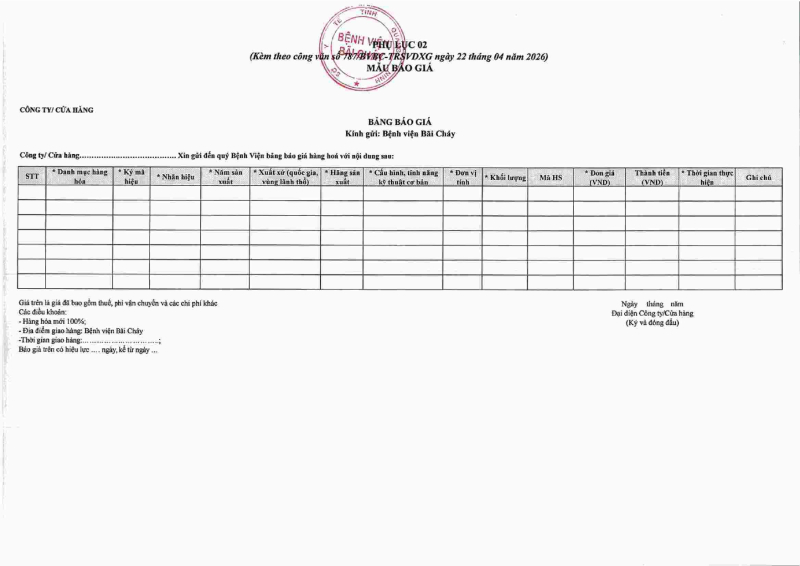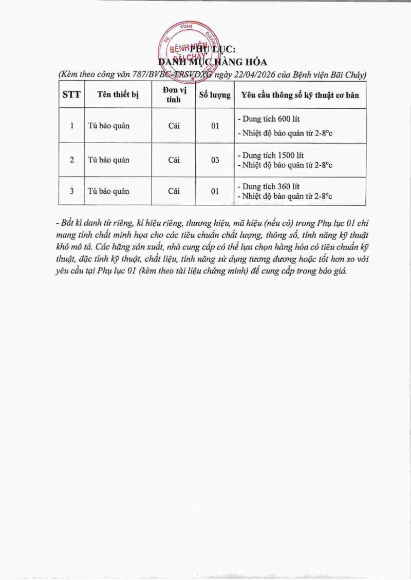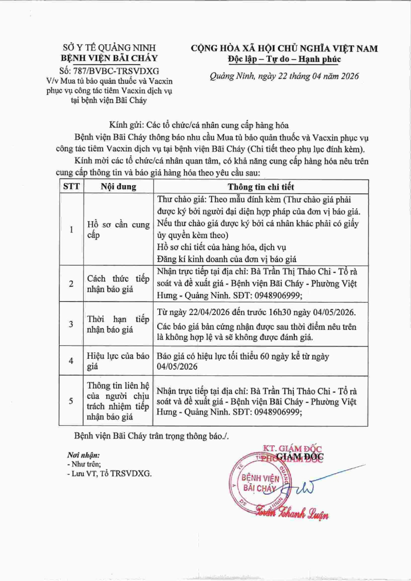 Thông báo số 787 về nhu cầu mua tủ bảo quản thuốc và vacxin phục vụ công tác tiêm vacxin dịch vụ tại Bệnh viện Bãi Cháy 2026/04/22 09:35