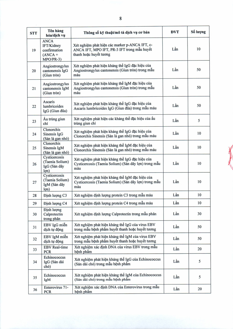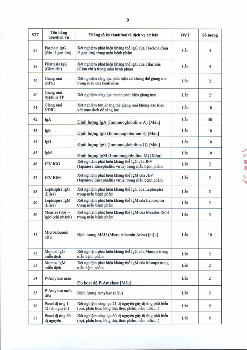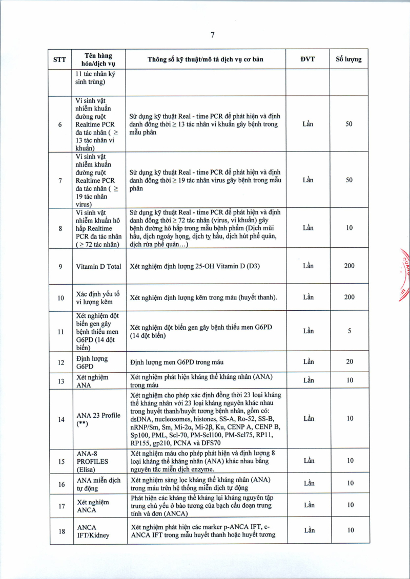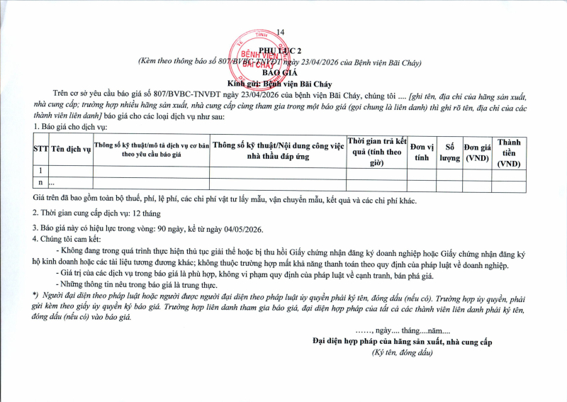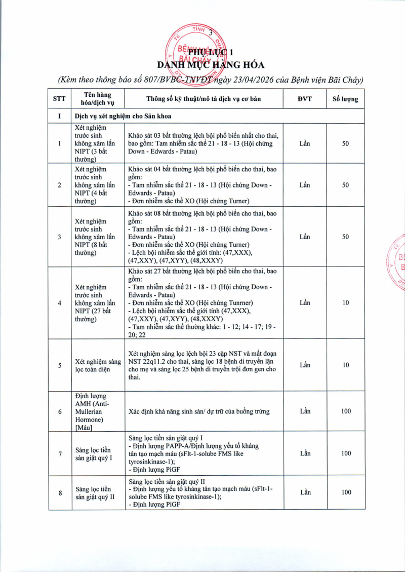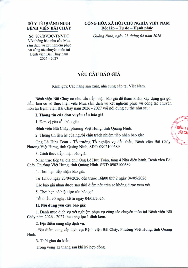 Thông báo số 807 về nhu cầu mua sắm dịch vụ xét nghiệm phục vụ công tác chuyên môn Tại bệnh viện bãi cháy năm 2026, 2027
