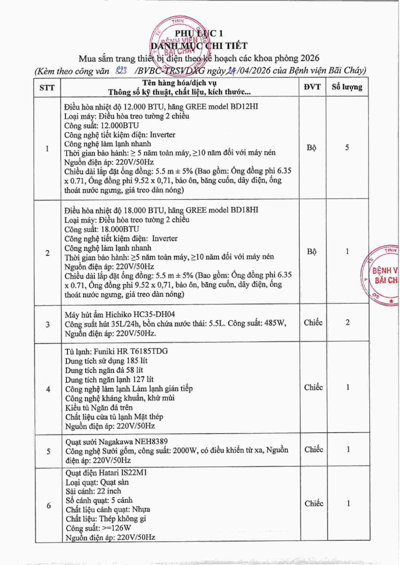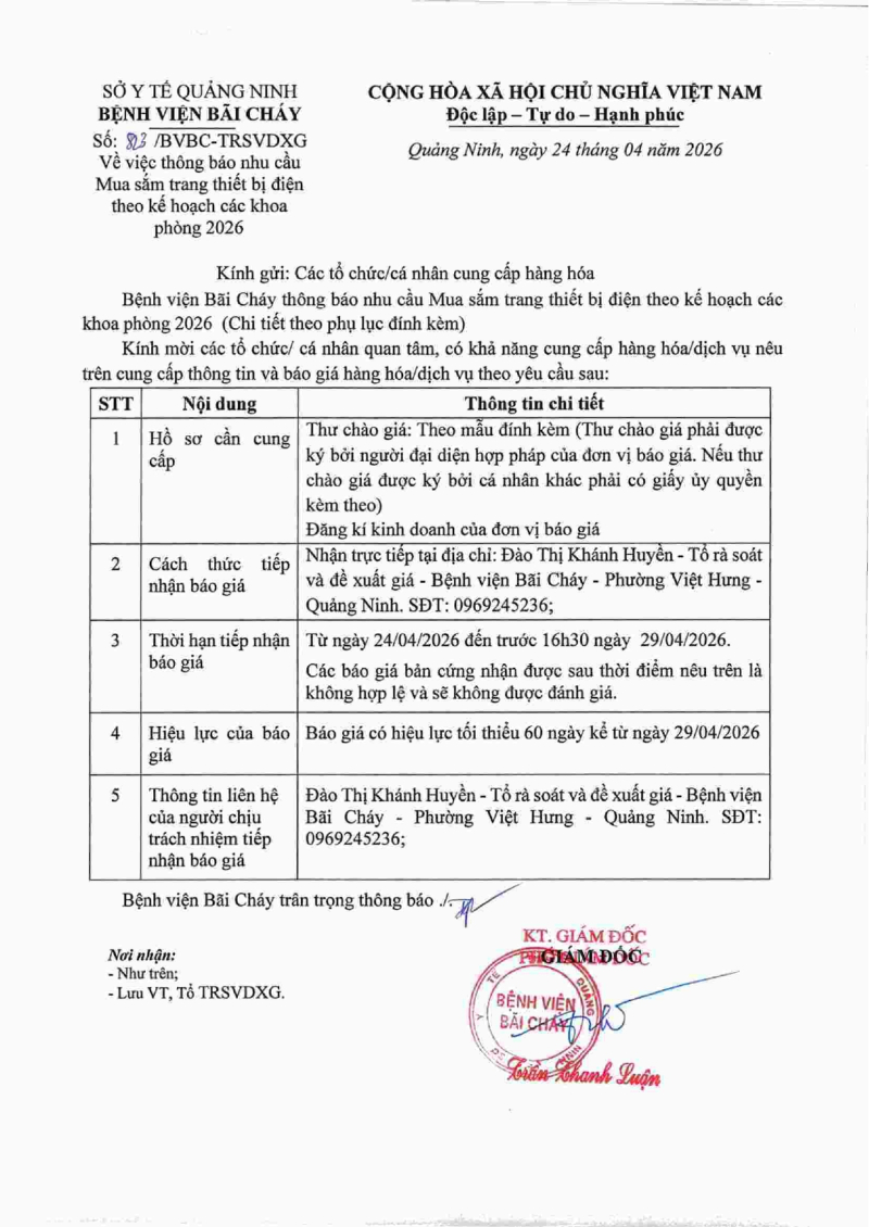 Thông báo số 823 về nhu cầu mua sắm trang thiết bị điện theo kế hoạch khoa phòng năm 2026