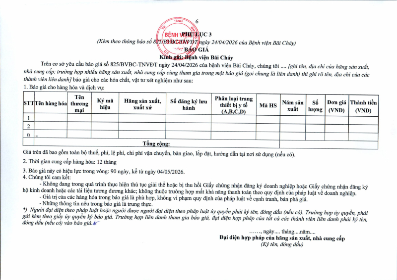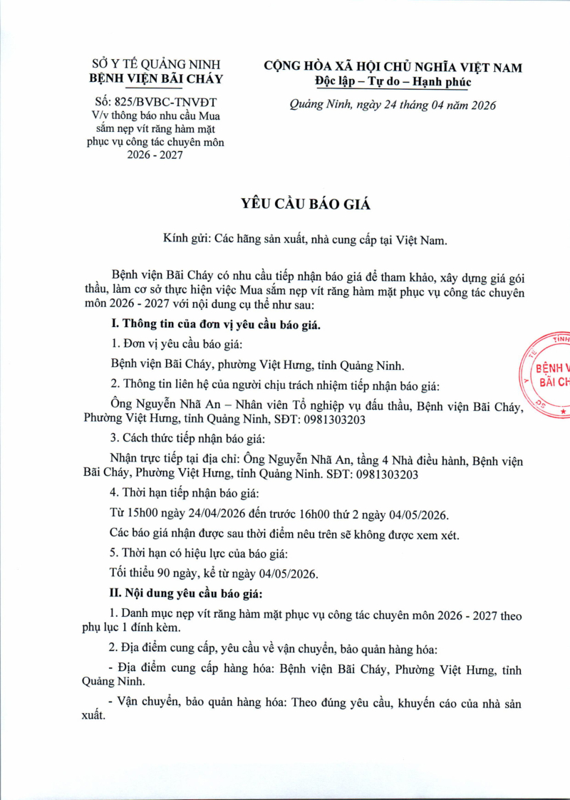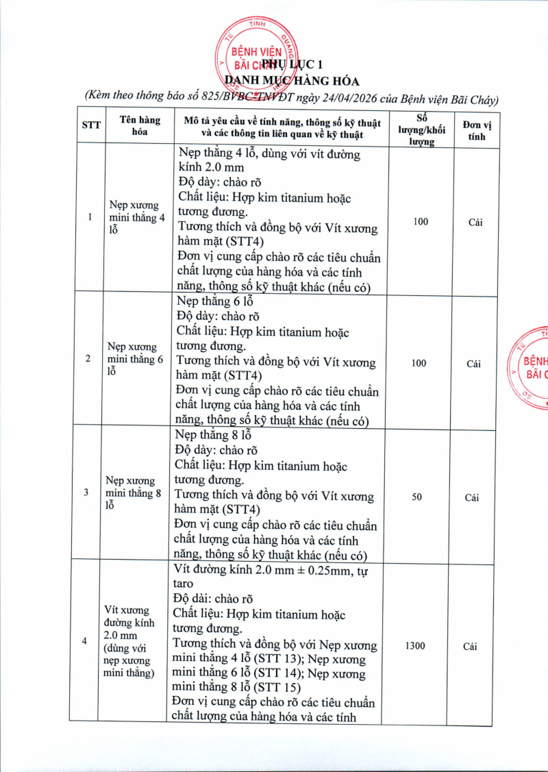 Thông báo số 825 về nhu cầu mua sắm nẹp vít răng hàm mặt phục vụ công tác chuyên môn 2026 - 2027 Hôm nay 04:20